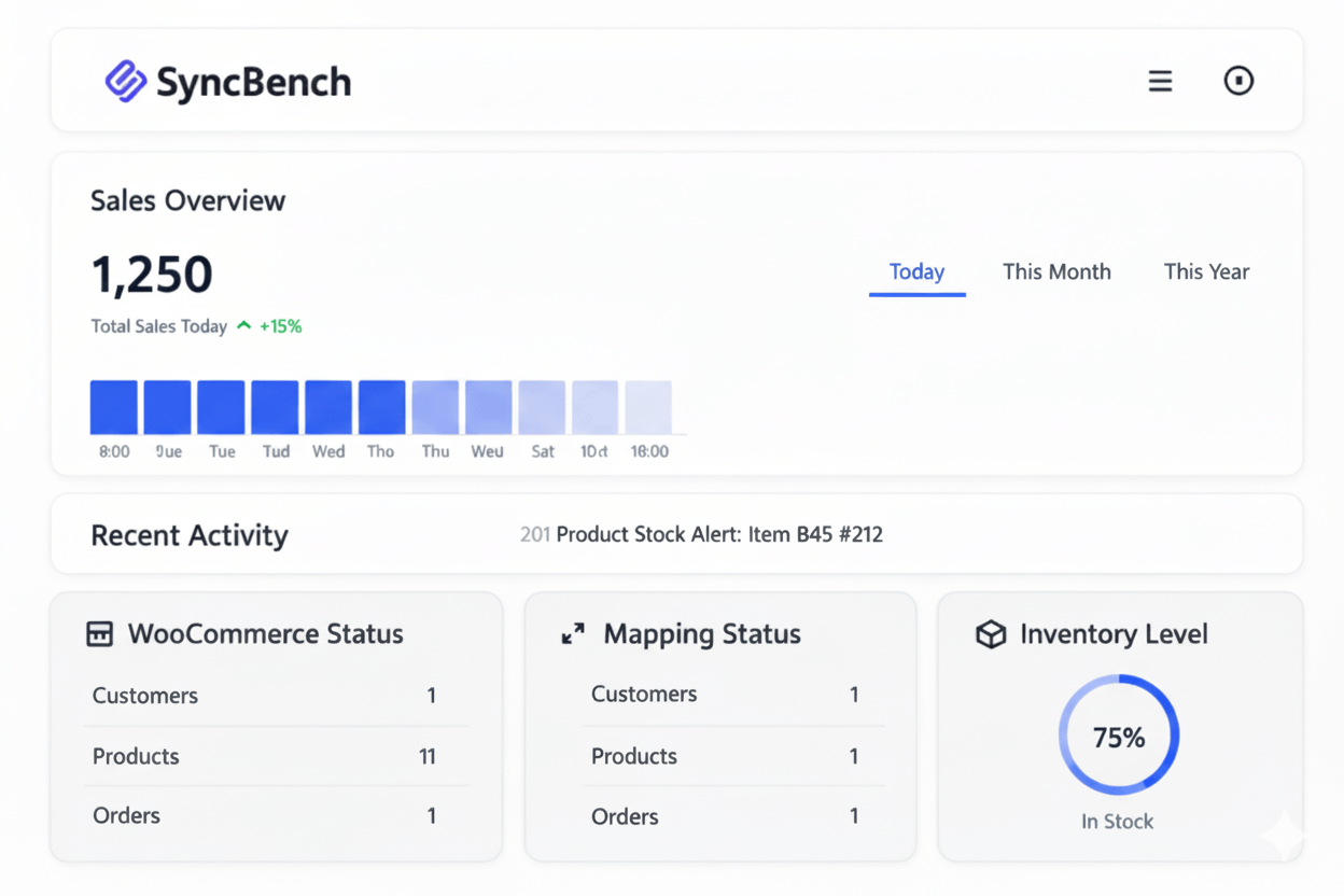 SyncBench is a powerful integration tool that bridges the gap between WooCommerce and QuickBooks Online, helping e-commerce businesses simplify accounting. Instead of juggling manual data entry, SyncBench keeps your customers, products, and orders synced in real time, ensuring your financial records always stay accurate and up to date. It works by connecting your WooCommerce store with QuickBooks Online and syncing data seamlessly across both platforms.